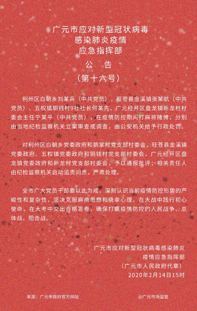 2月14日,廣元市應(yīng)對(duì)新型冠狀病毒感染肺炎疫情應(yīng)急指揮部發(fā)布15號(hào)、16號(hào)公告。