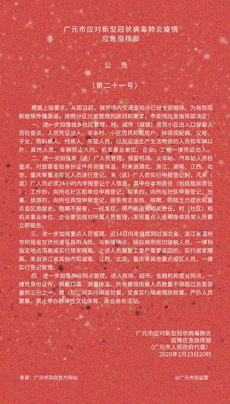 23日,廣元市應對新型冠狀病毒肺炎疫情應急指揮部發布第21號公告。