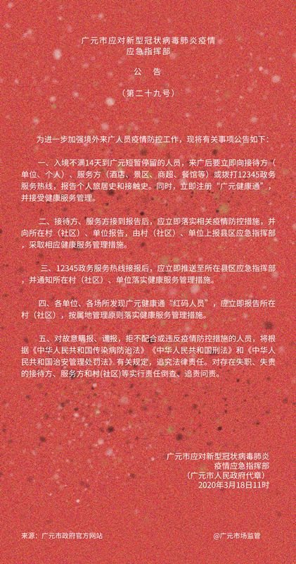 3月18日,廣元市應對新型冠狀病毒肺炎疫情應急指揮部發布第29號公告。