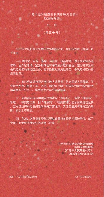 3月19日,廣元市應(yīng)對新型冠狀病毒肺炎疫情應(yīng)急指揮部發(fā)布第30號公告。