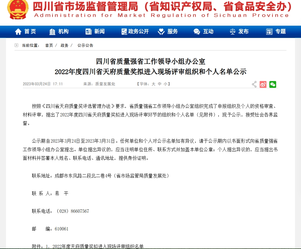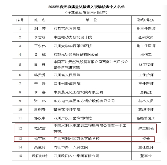 2023年3月24日,四川省質(zhì)量強省工作領(lǐng)導(dǎo)小組辦公室發(fā)布2022年度四川省天府質(zhì)量獎擬進入現(xiàn)場評審組織和個人公示名單,我市范欣言、楊宇恒兩人入圍2022年度天府質(zhì)量獎擬進入現(xiàn)場核查個人名單,這也是我市第一次入圍天府質(zhì)量獎現(xiàn)場核查。