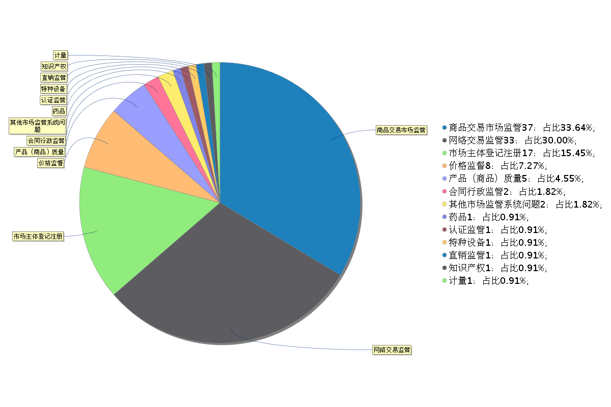 從咨詢問題的類別來看,咨詢量較大的問題主要有商品交易市場監管(37件)、網絡交易監管(33件)、市場主體登記注冊(17件)、價格監督(8件)、產品(商品)質量(5件),合計占比93.46%。