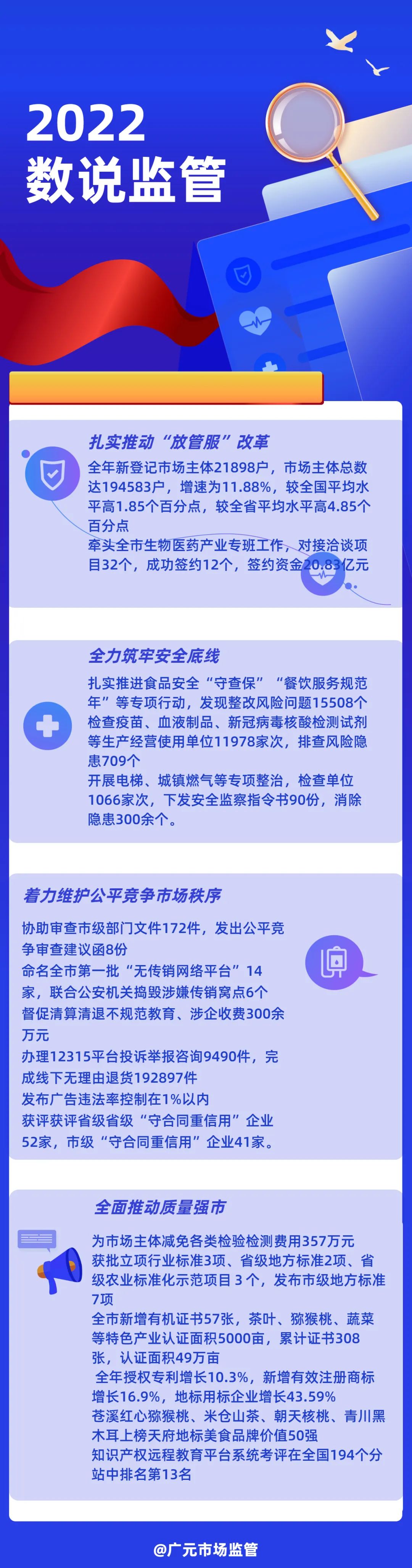 會議要求:2023年要重點抓好五個方面工作。一是以更強責任感守牢安全底線。強化底線思維、極限思維,保持一失萬無的高度警覺,下最大力氣抓好食品、藥品、重要工業產品質量、特種設備安全監管。全力爭創國家食品安全示范城市。二是以更高標準優化營商環境。聚焦打造最優營商環境目標,進一步便捷市場準入準出,進一步維護公平競爭秩序,進一步強化知識產權保護利用,以優質主動服務進一步激發市場主體活力。三是以更大力度推動質量強市。著力抓好質量提升,夯實計量技術基礎,強化標準引領,提升認證認可和檢驗檢測服務發展效益,服務高質量發展。四是以更優機制提升監管效能。不斷創新舉措,強化法治市場監管,提升監管精度,形成監管合力,構建完善以“雙隨機、一公開”為基本手段,以網監、廣告、消保、執法、信息化等重點監管為補充,以信用監管為基礎的市場監管新機制。五是以更實舉措助力產業發展。強化發展意識和服務意識,自覺以服務產業發展為己任,全力抓好生物醫藥產業專班牽頭工作,積極做好參與的食品飲料、肉牛羊、現代商業貿易、茶葉等其他專班工作任務,特別是食品藥品重點企業,要探索建立上門服務機制,指導企業及時規范生產。