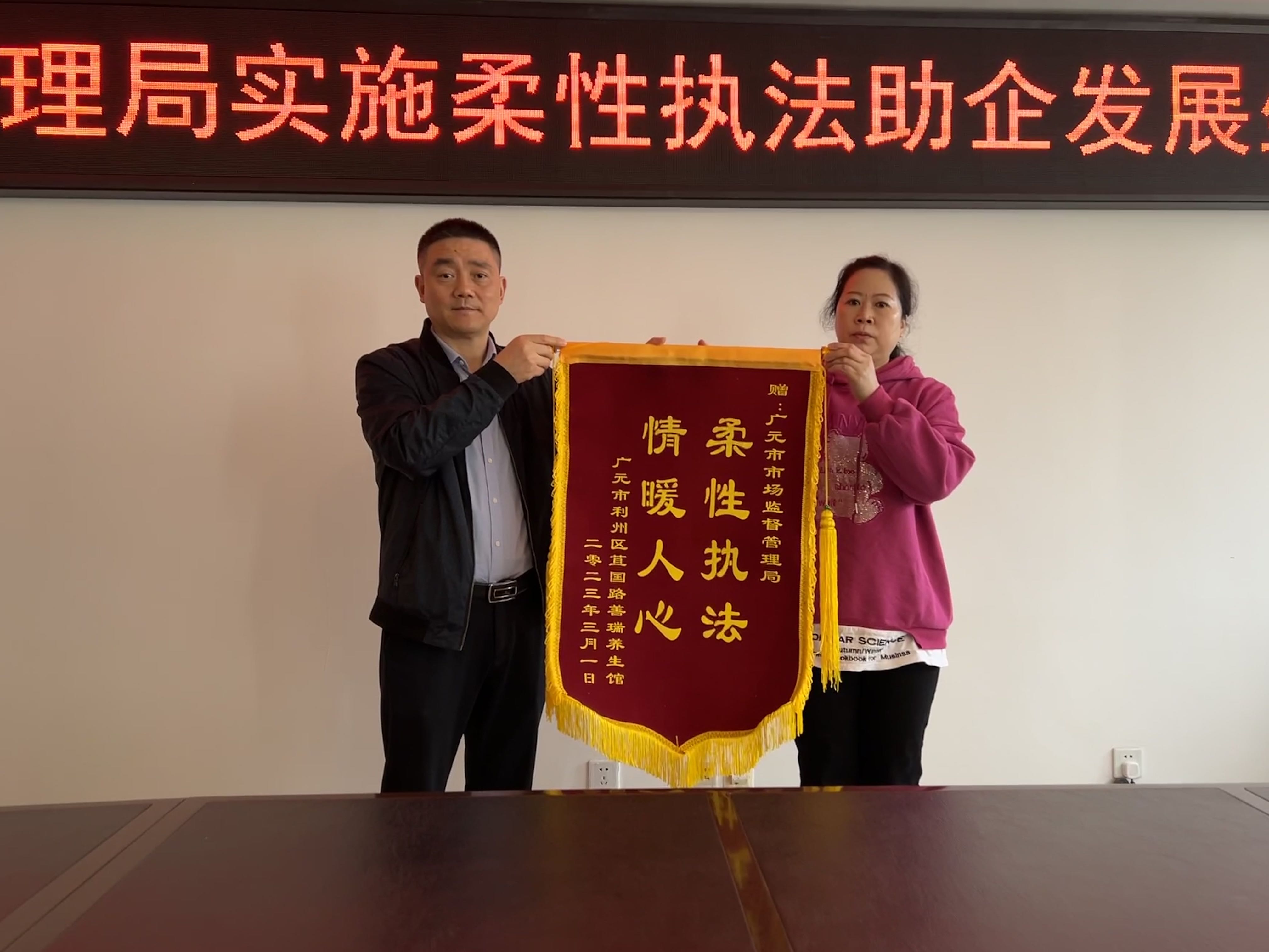 會(huì)議最后,經(jīng)營(yíng)戶代表為我局送上內(nèi)容為“柔性執(zhí)法 情暖人心”的錦旗一幅,感謝我局以有“溫度”的執(zhí)法助企紓困,保護(hù)市場(chǎng)主體不因小錯(cuò)影響生存發(fā)展。