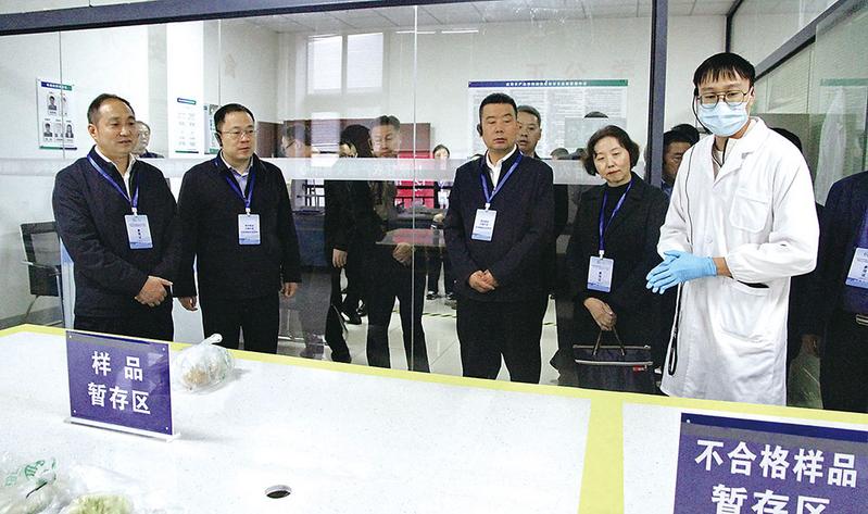 (圖為與會人員前往川陜甘農產品交易中心,現場調研推行食用農產品承諾達標合格證、快速檢測、追溯體系建設等情況。)