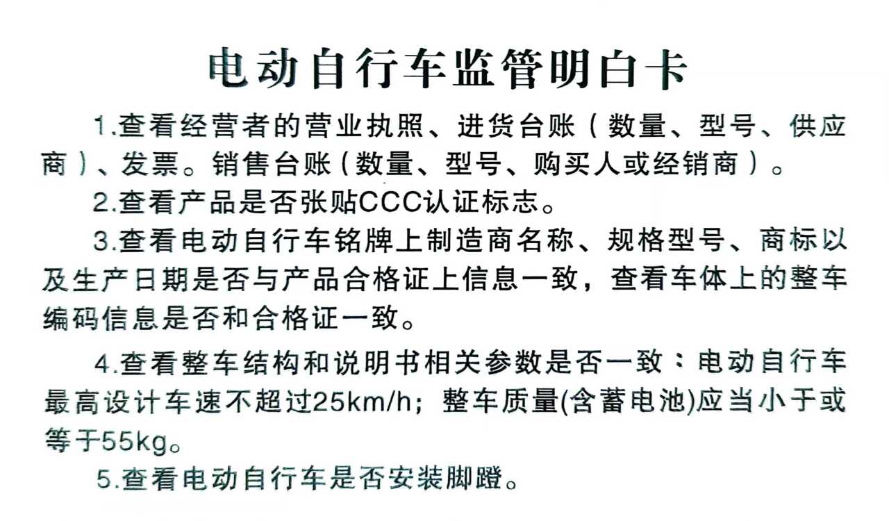 印發(fā)一套資料培養(yǎng)“明白人”。電動自行車安全隱患全鏈條整治涉及標準、政策及法律法規(guī),市市場監(jiān)管局印制電動自行車監(jiān)管明白卡、電動自行車經(jīng)銷驗收手冊、電動自行車銷售門店承諾書、警示標語、產(chǎn)品質(zhì)量法、“一圖讀懂”兩個規(guī)定等6類宣傳資料,全覆蓋張貼、發(fā)放到全市電動自行車銷售經(jīng)營單位、縣(區(qū))市場監(jiān)管局及基層監(jiān)管所,監(jiān)管人員在檢查指導中開展宣傳,培養(yǎng)銷售經(jīng)營合標電動自行車“明白人”。