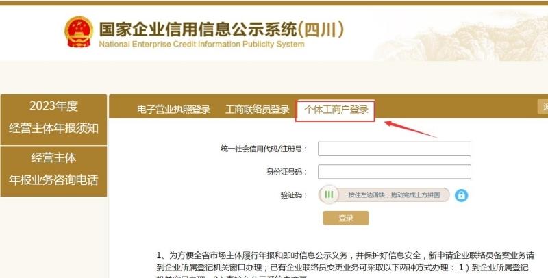 第三步:選擇個體工商戶登錄,填入營業執照上的統一社會信用代碼和經營者身份證號碼