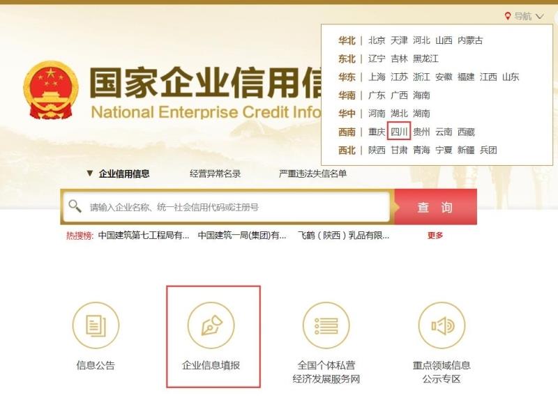第二步:選擇四川,點擊企業信息填報(個體工商戶也點擊這里)