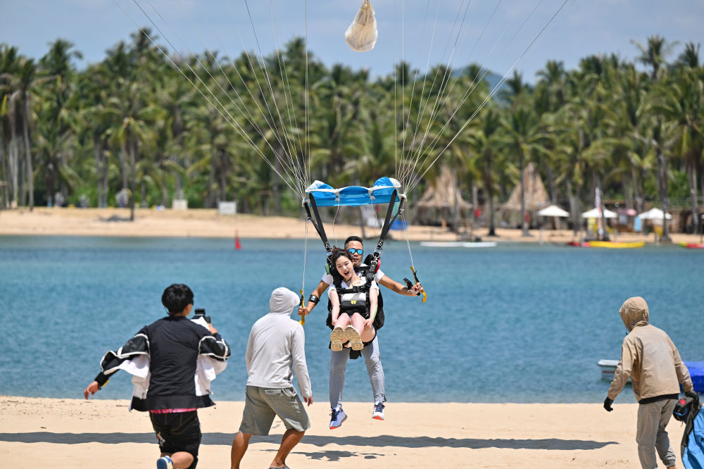 5月2日,游客在三亞塔赫跳傘基地體驗跳傘。新華社記者 郭程 攝