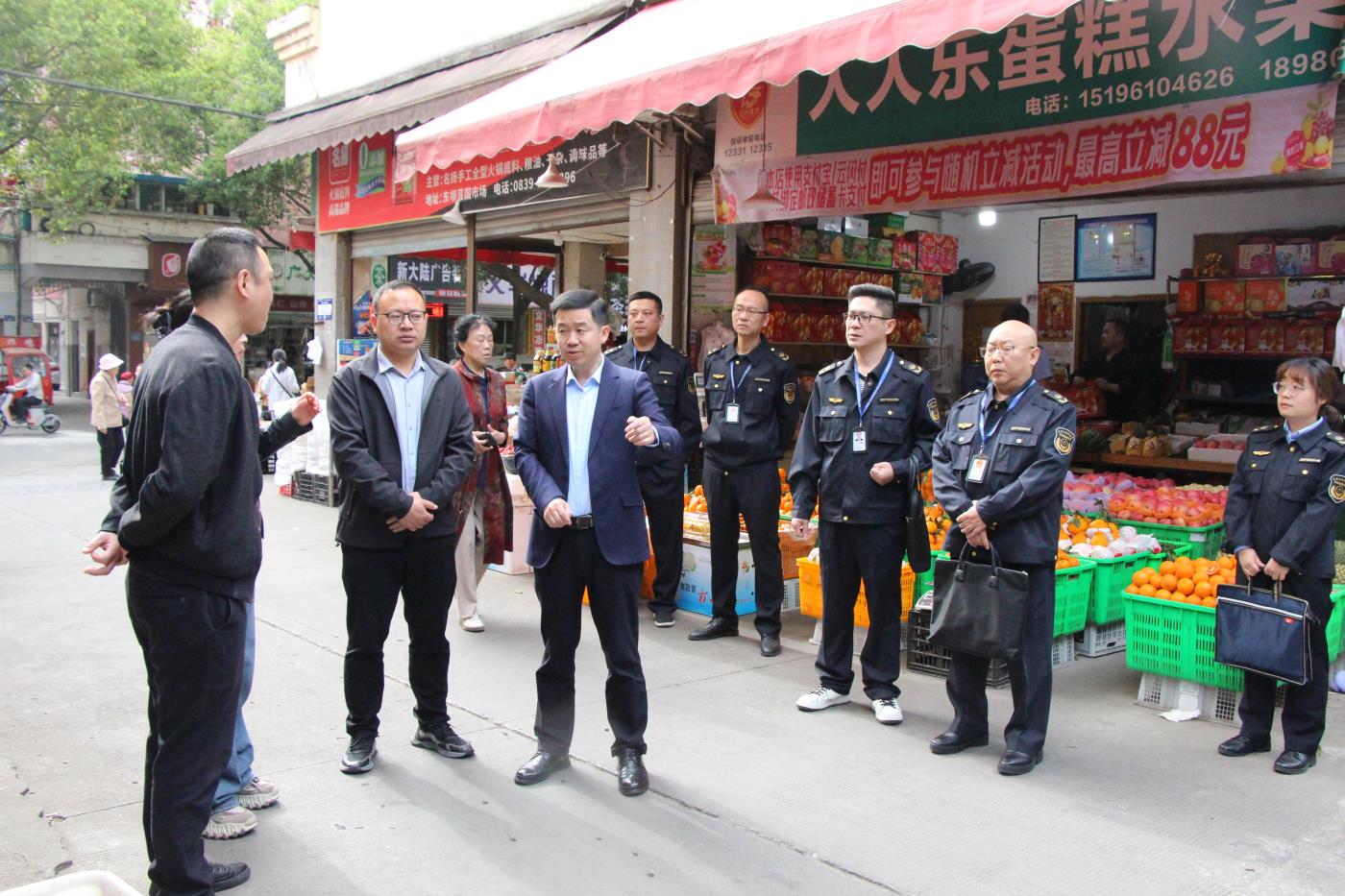 為全面落實全市市場監管工作“1149”工作思路,狠抓九大專項落實落地,進一步規范市場秩序、守牢安全底線,切實保障消費者合法權益。4月9日,黨組書記、局長王華南帶隊以“四不兩直”方式深入農貿市場、電動自行車銷售單位、消防器材門店、酒店等重點經營場所,對市場秩序專項整治行動情況進行督導檢查。安全總監陳少華參加檢查。